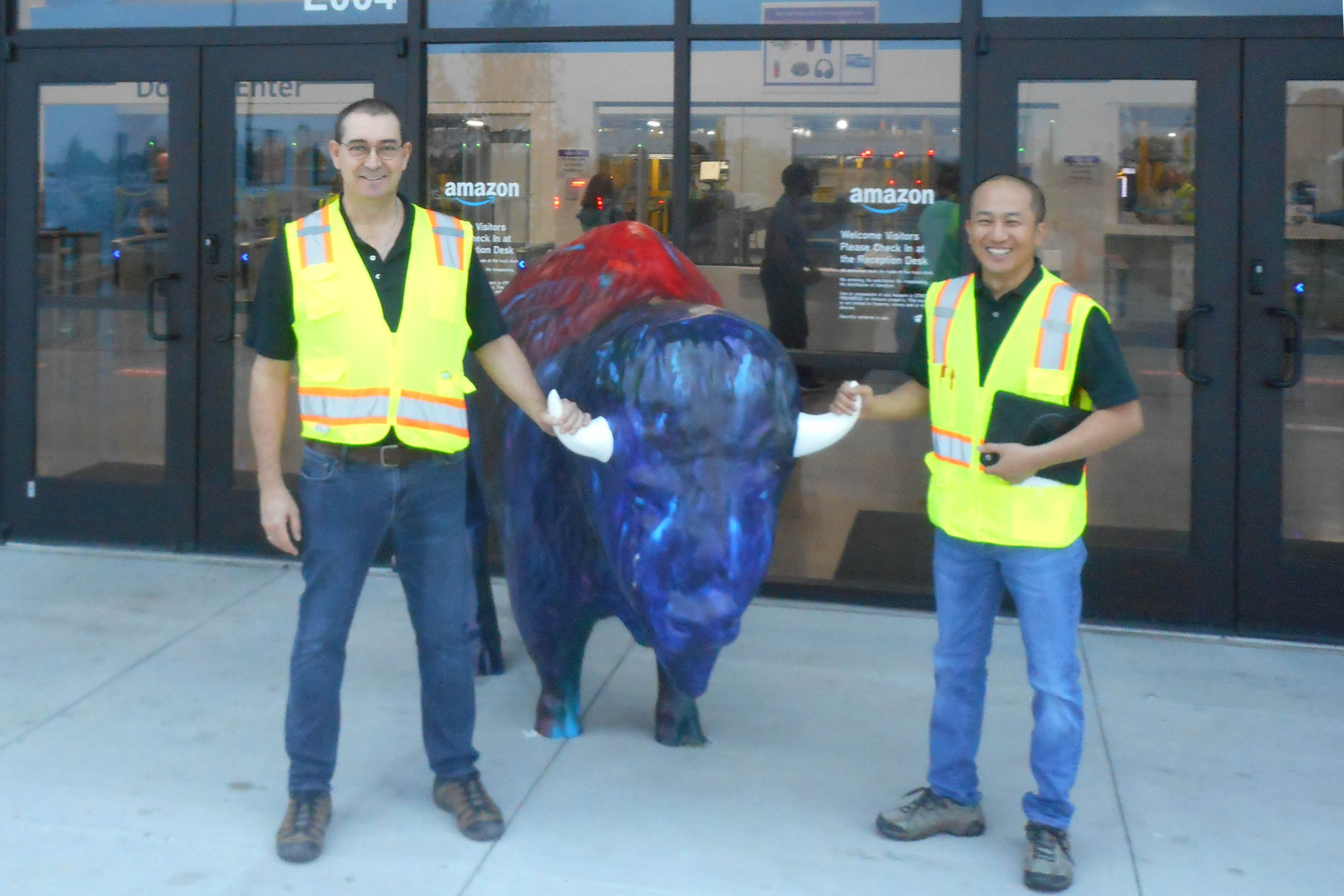 Fed and Yong Mo Kim pose with a buffalo at an Oklahoma Amazon facility.