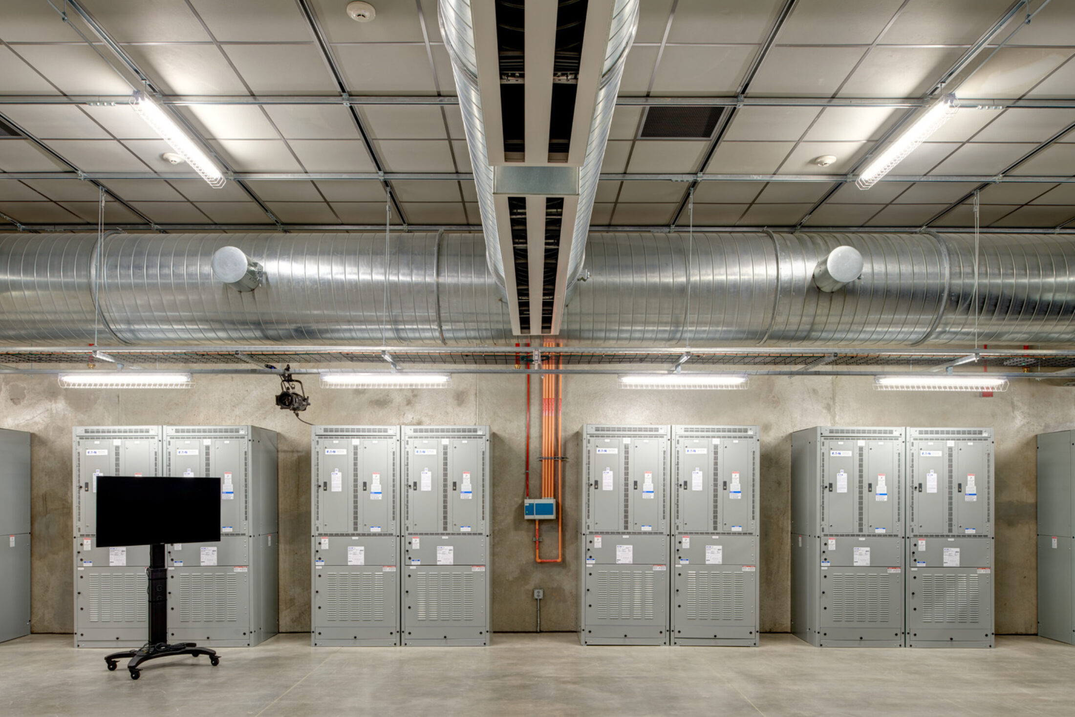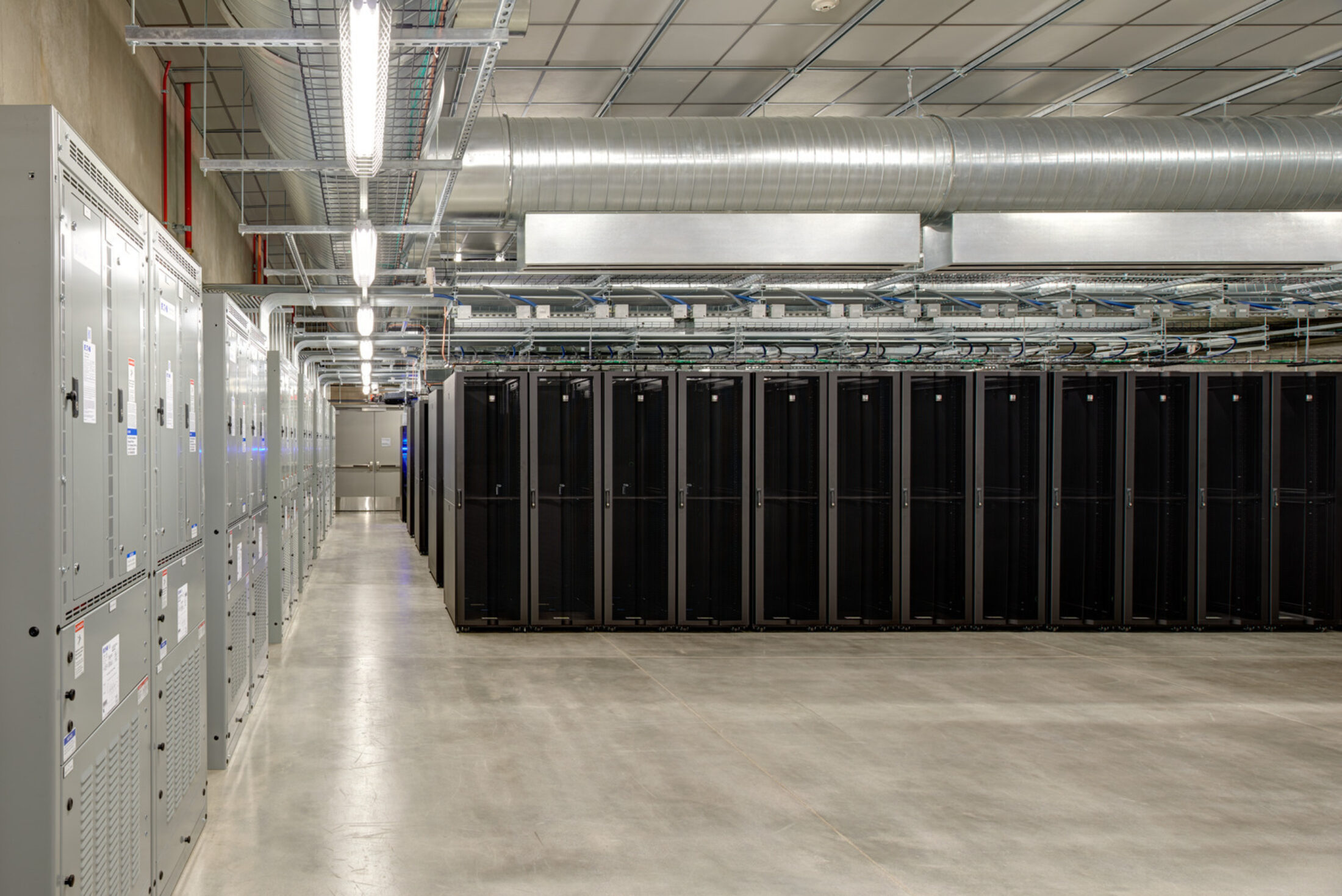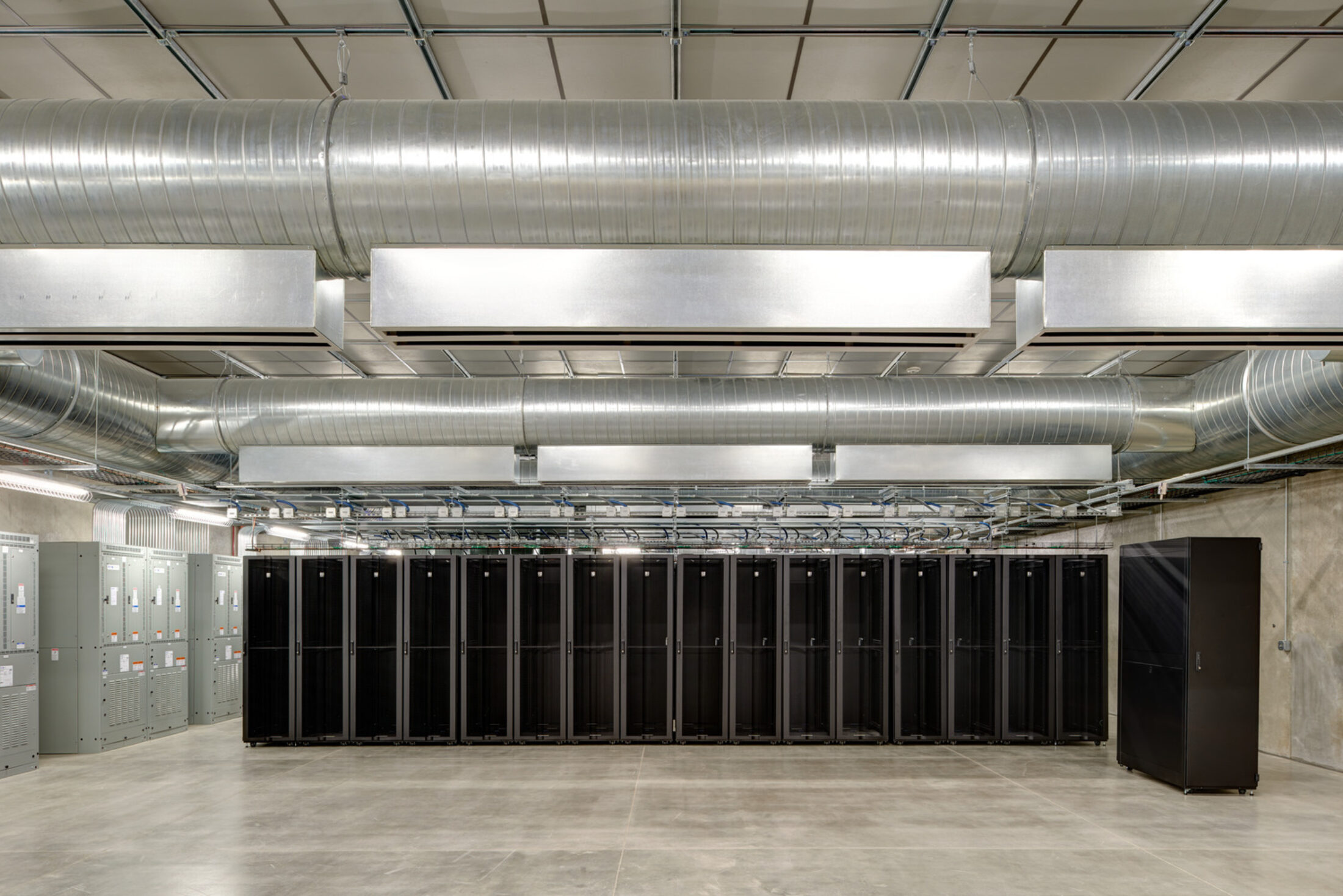 The data center contains two 4,000 sf data rooms for mission-critical servers. Other spaces within the building provide redundant mechanical, electrical, and telecom services for these data rooms, which improves reliability for clients. Separating all access work spaces, storage, and loading dock from critical spaces such as the data rooms allowed for increased security.