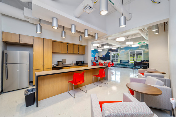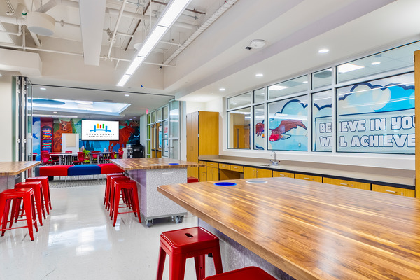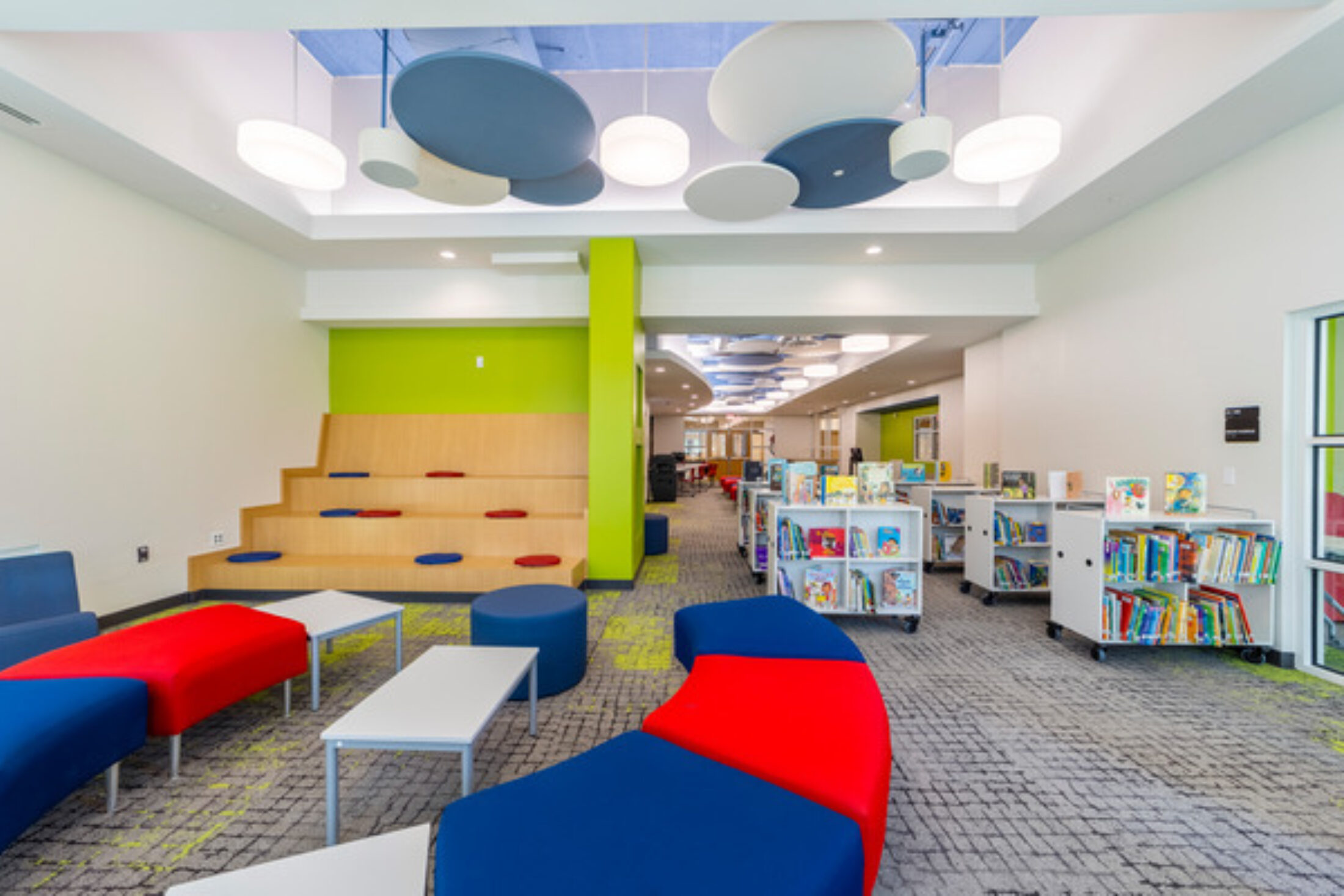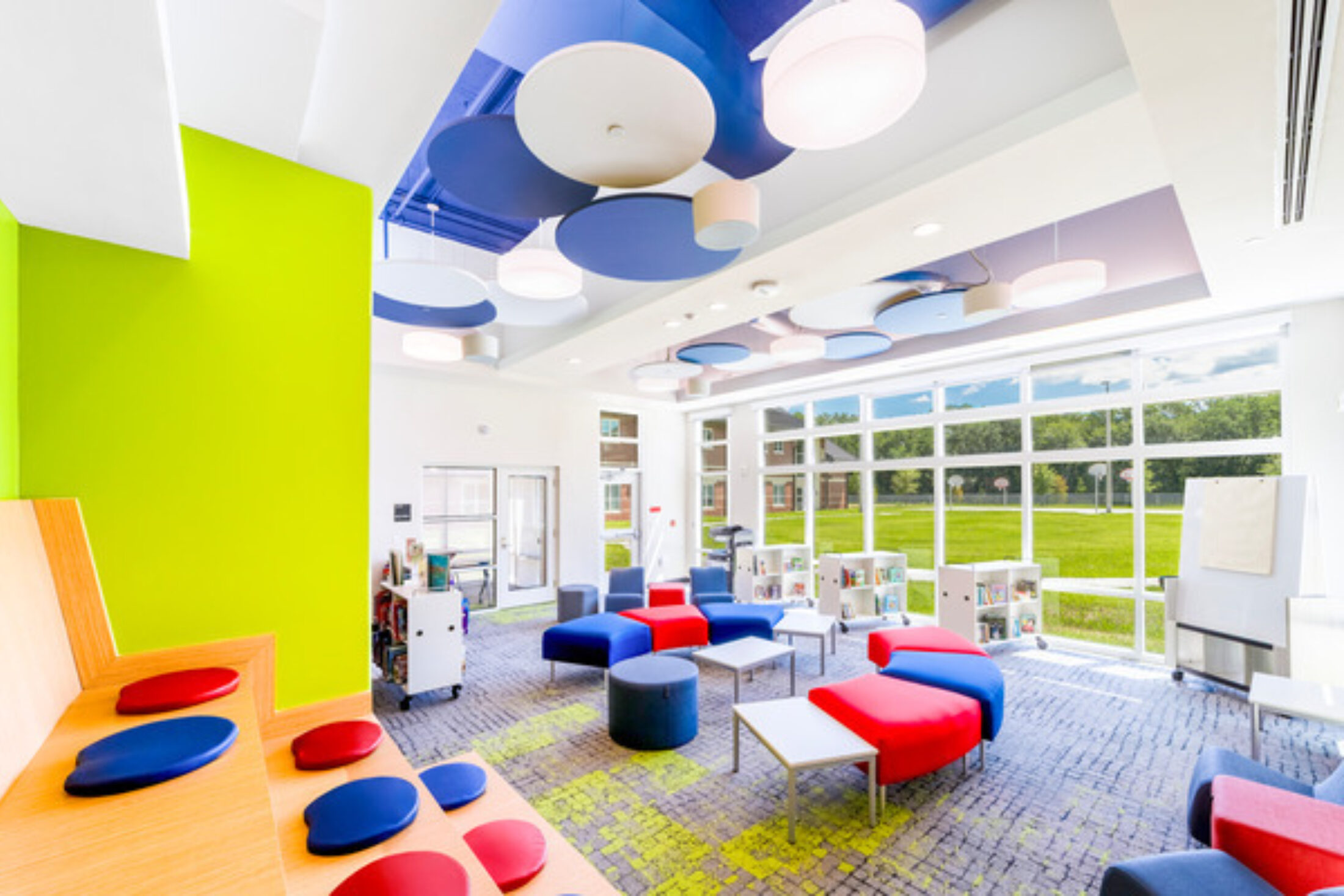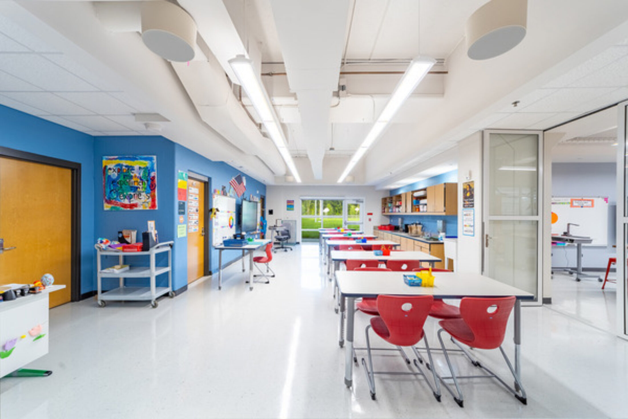 Academic functions are located within a two-story classroom wing organized in a “horseshoe” plan that frames secure outdoor courtyards and gathering spaces. The ground floor hosts a Media Center, Maker Space, Science and Technology Labs, and an Art Room — each designed with movable glass partitions to encourage interaction and reconfiguration. Throughout the building, shared learning areas and flexible classroom clusters provide diverse opportunities for individual focus and group collaboration, creating an environment that inspires curiosity, creativity, and connection.
